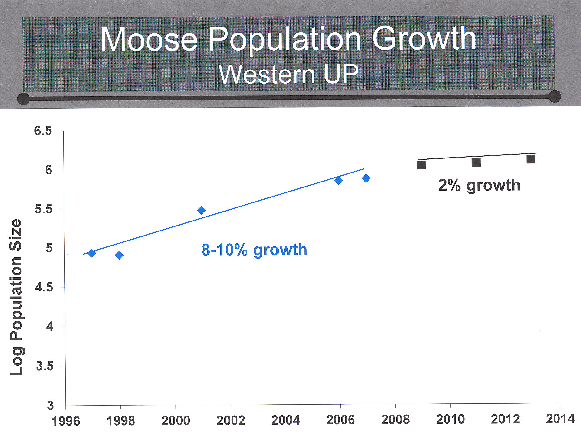 As many know, the goal of having a sustainable moose herd in Michigan which could some day offer a recreational hunt began in earnest with the 1985 and 1987 releases. During the 1996 to 2007 period, annual population growth rates were estimated to be 8% to 10%, with the 2007 Western U.P. total estimated to have been approximately 350.